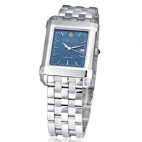 University of Chicago mens steel watch featuring Chicago shield at 12 oclock and University of Chicago inscribed below on the blue dial Swiss-made quartz movement with 7 jewels Blue dial with hand-applied faceted markers and date window Stainless steel case with Swarovski black crystal caboc Read More..