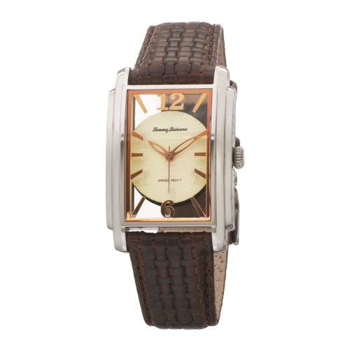 Intriguing textures and dual tones make this Tommy Bahama watch a handsome catch The Tommy Bahama Mens Santiago Leather Watchs 21-millimeter-wide woven leather band joins a rectangular stainless steel case that measures 31 millimeters A polished silver-tone art-deco-influenced bezel beautiful Read More..