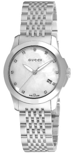 The elegant GUCCI Womens Timeless Watch features a circular mother-of-pearl dial that displays wide silver-toned hands along with diamond-filled square-shaped hour indexes and a date display at the four oclock position The stainless steel bezel and case frame the dial and provide strength and Read More..